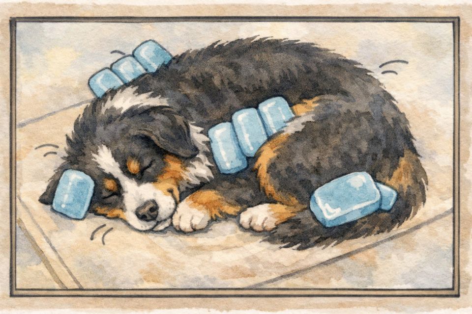 お部屋を涼しく保ち、保冷剤や氷枕でおなか・首元・頭をやさしく冷やしてください。必要に応じて、こまめに拭いてあげましょう。