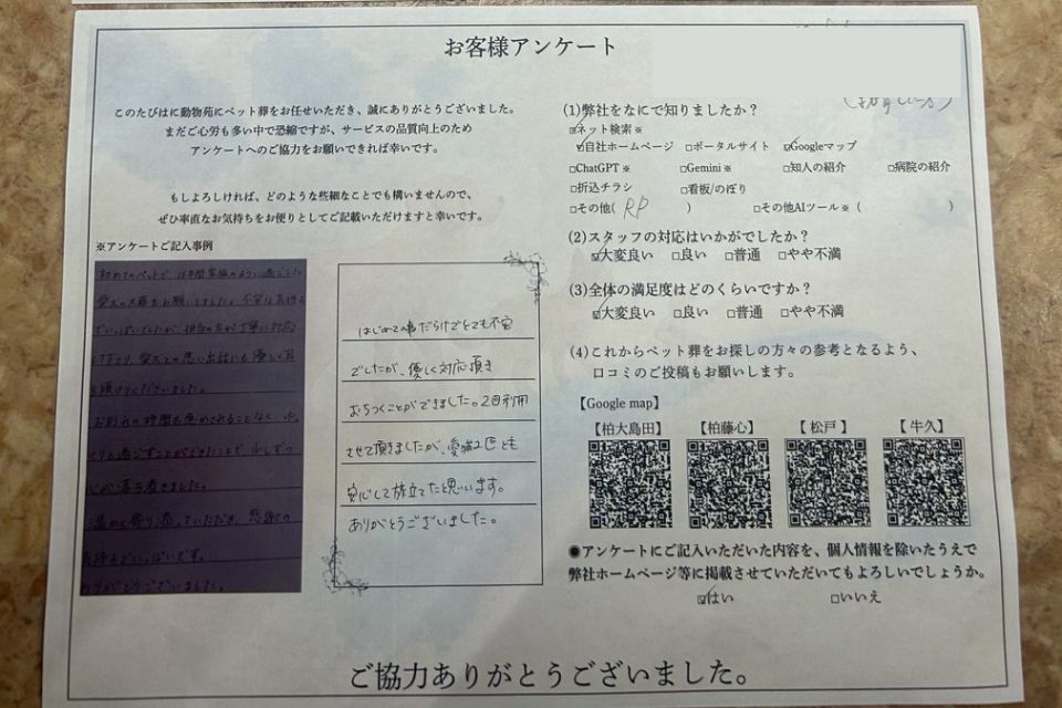 動物苑では、ペット葬を終えられたご家族の皆さまにアンケートへのご協力をお願いし、いただいたお声を大切にしながら、心に寄り添うペット葬のご提供に努めております。