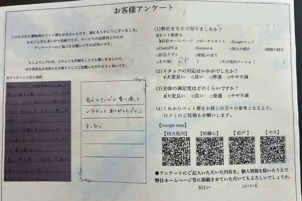 動物苑では、ペット葬を終えられたご家族の皆さまにアンケートへのご協力をお願いし、いただいたお声を大切にしながら、心に寄り添うペット葬のご提供に努めております。