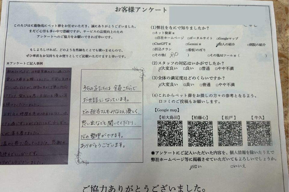 動物苑では、ペット葬を終えられたご家族の皆さまにアンケートへのご協力をお願いし、いただいたお声を大切にしながら、心に寄り添うペット葬のご提供に努めております。