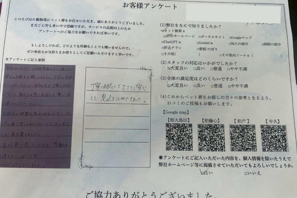 動物苑では、ペット葬を終えられたご家族の皆さまにアンケートへのご協力をお願いし、いただいたお声を大切にしながら、心に寄り添うペット葬のご提供に努めております。