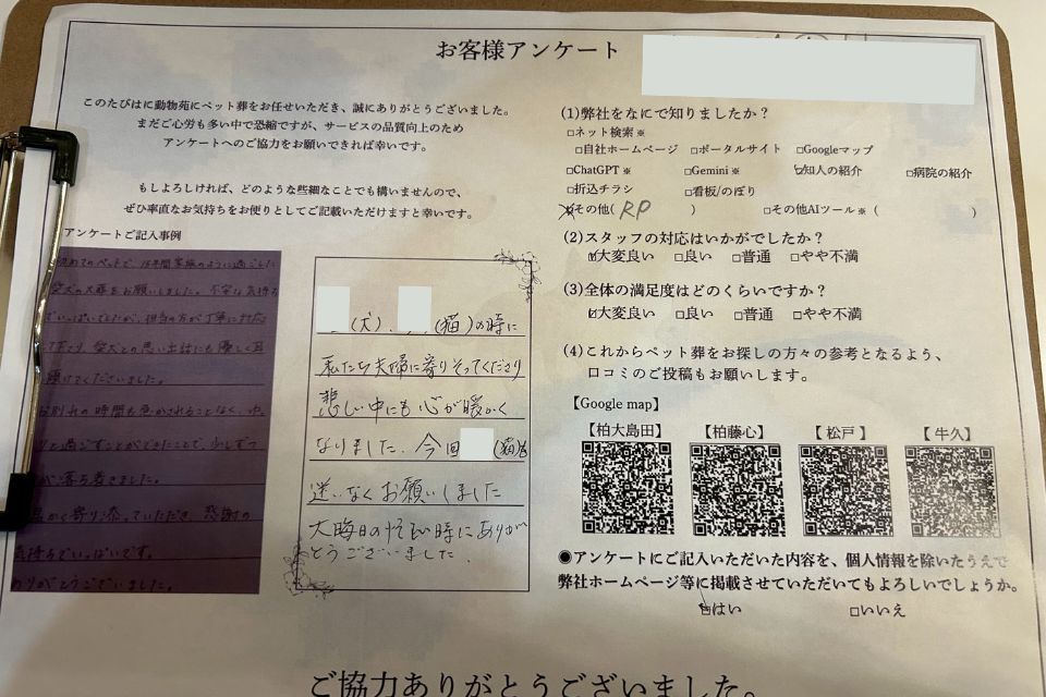 動物苑では、ペット葬を終えられたご家族の皆さまにアンケートへのご協力をお願いし、いただいたお声を大切にしながら、心に寄り添うペット葬のご提供に努めております。