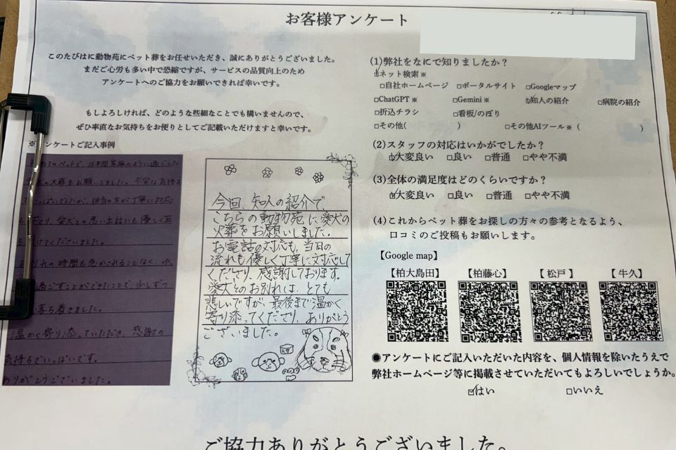 動物苑では、ペット葬を終えられたご家族の皆さまにアンケートへのご協力をお願いし、いただいたお声を大切にしながら、心に寄り添うペット葬のご提供に努めております。